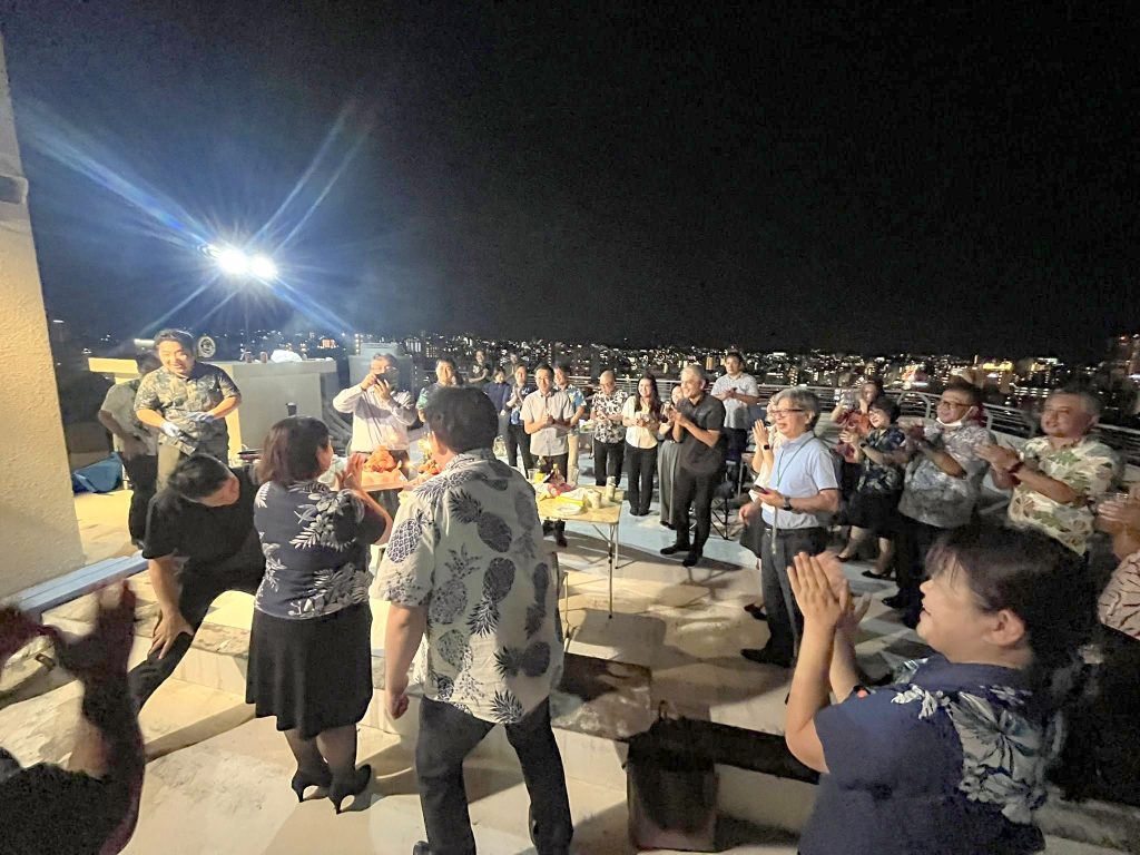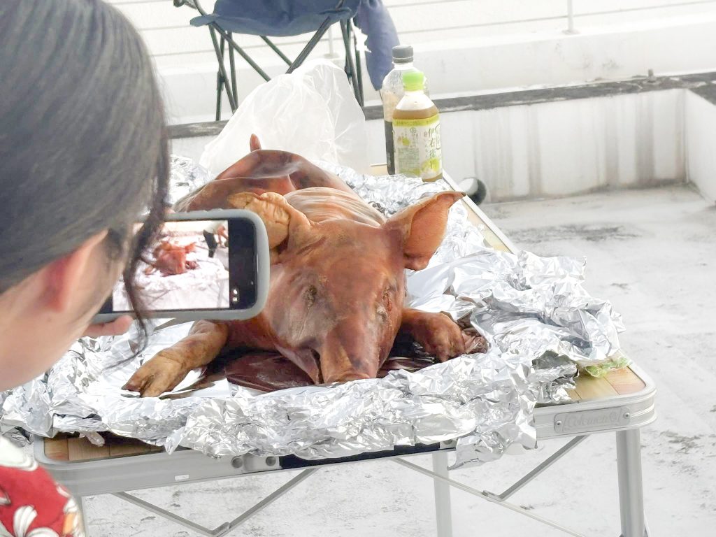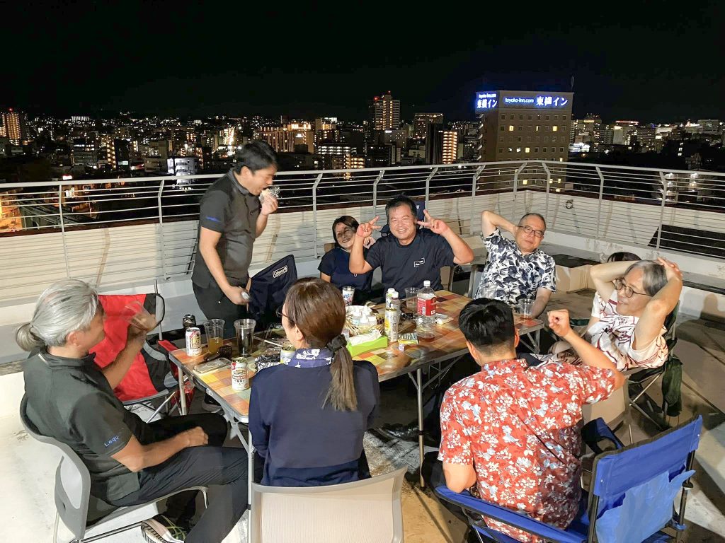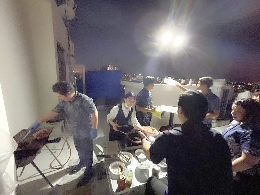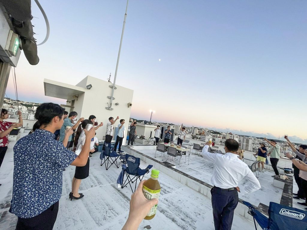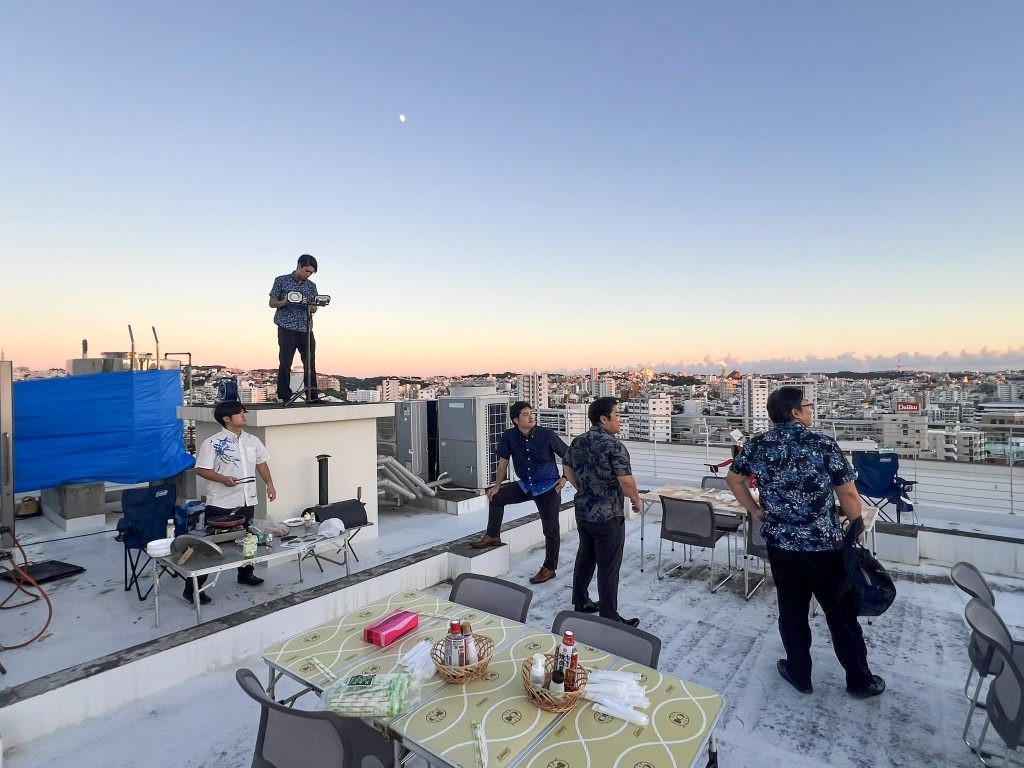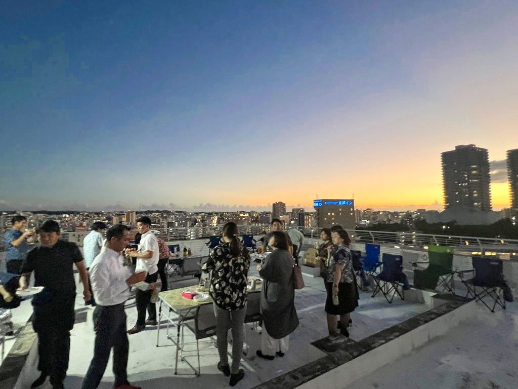 沖縄も少しずつ日が落ちるのが早くなっていき、空が変わりゆく様子をレキオス駅前ビルの屋上から見ながら、普段別部署で中々関わりが少ない方とお話ししたり、比嘉畜産さんの豚の丸焼きや営業メンバーが一生懸命焼いたお肉やピザを食べたり飲んだりと楽しんでいました♪